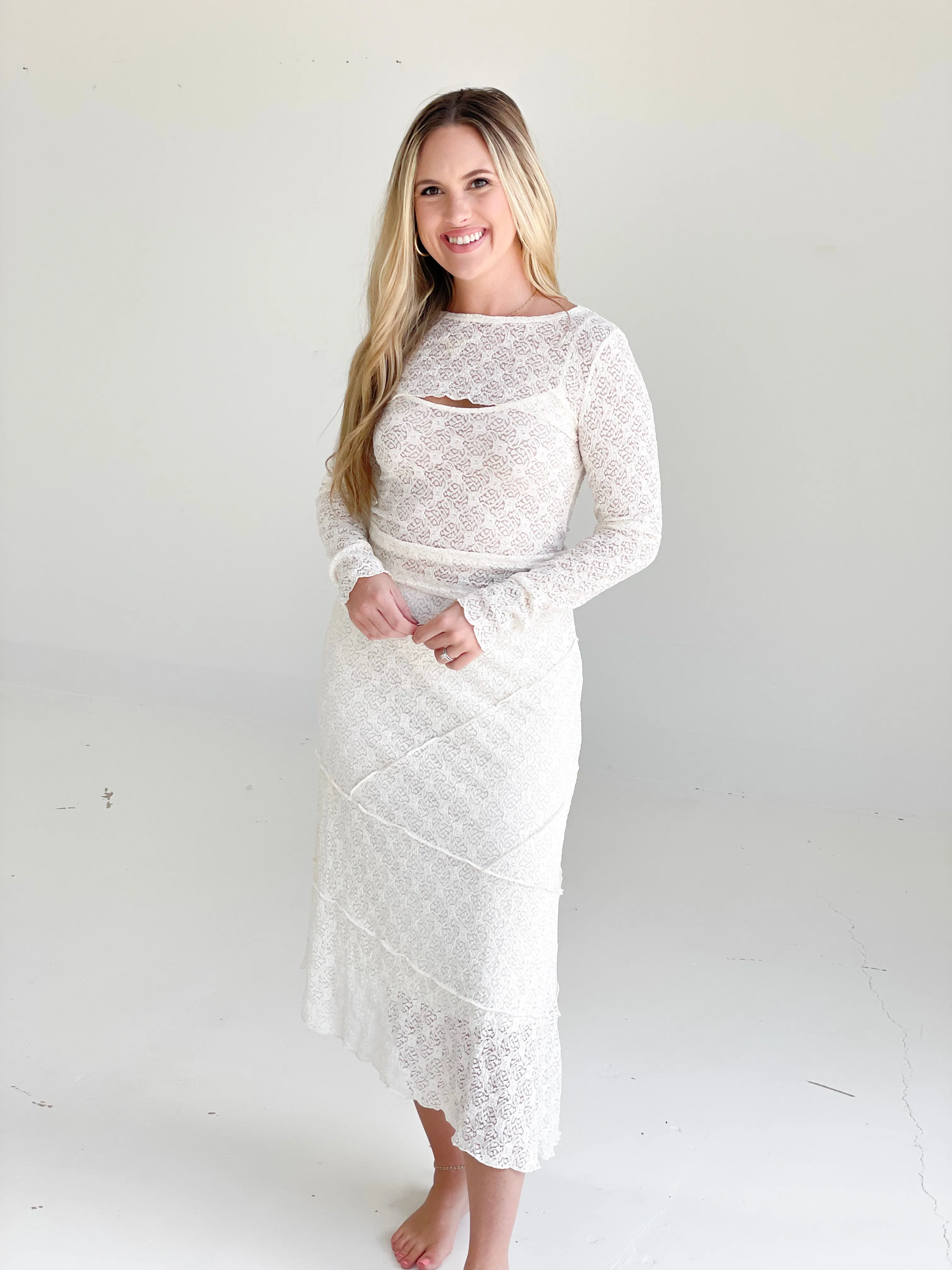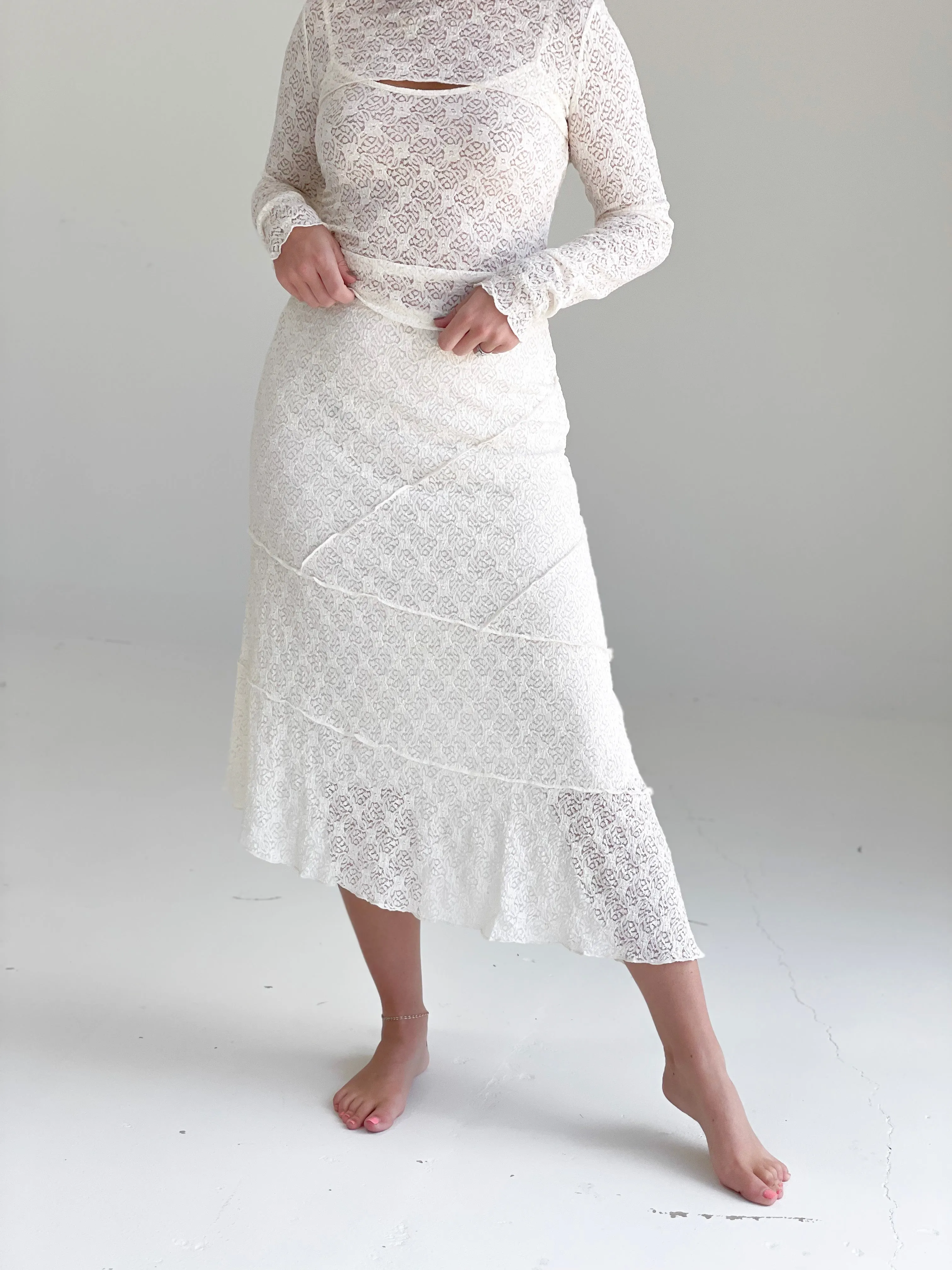 Elevate your wardrobe with our Pretty Little Midi Skirt. This feminine and delicate skirt features a fully-lined, asymmetrical hem, giving it an elegant and unique touch. The lace-like design adds a touch of sophistication, making it the perfect match for our Pretty Little Two Piece Top. Elevate your style and turn heads with this must-have piece!