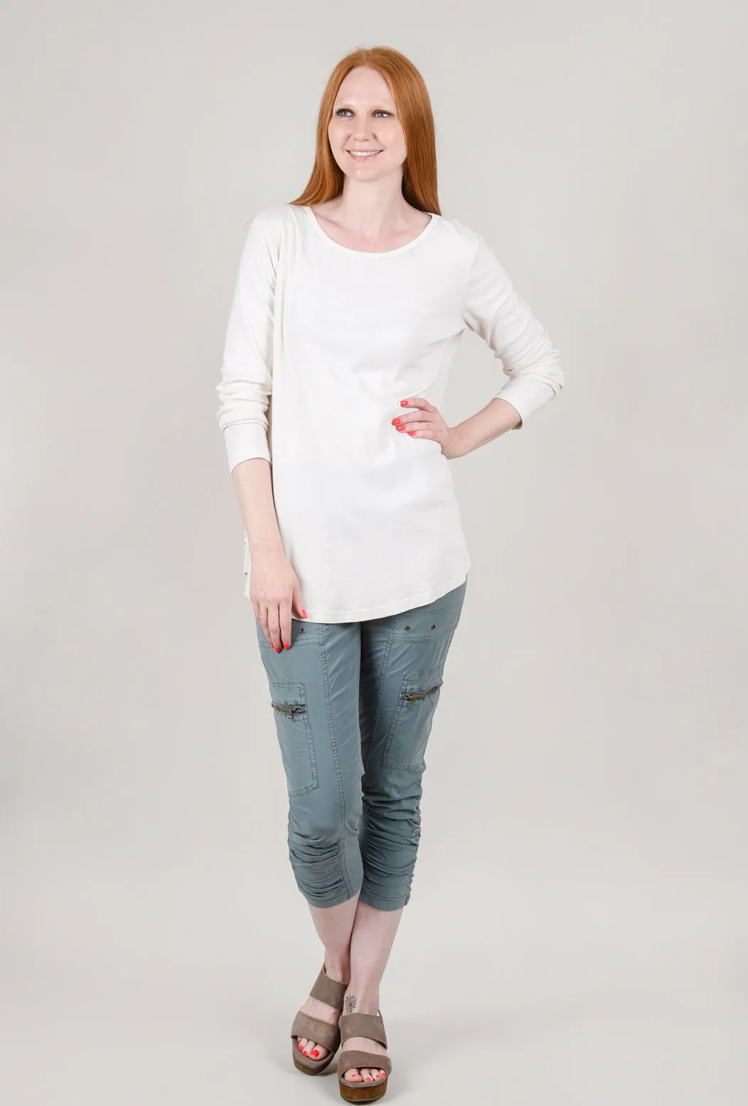 Because sometimes you just need a basic tee! Crafted in lightly ribbed cotton jersey knit, this relaxed T-shirt has a scoop neckline, long sleeves and an A-line silhouette. The rounded shirttail hemline and easy, swingy shape have made this an in-store customer go-to in seasons past.