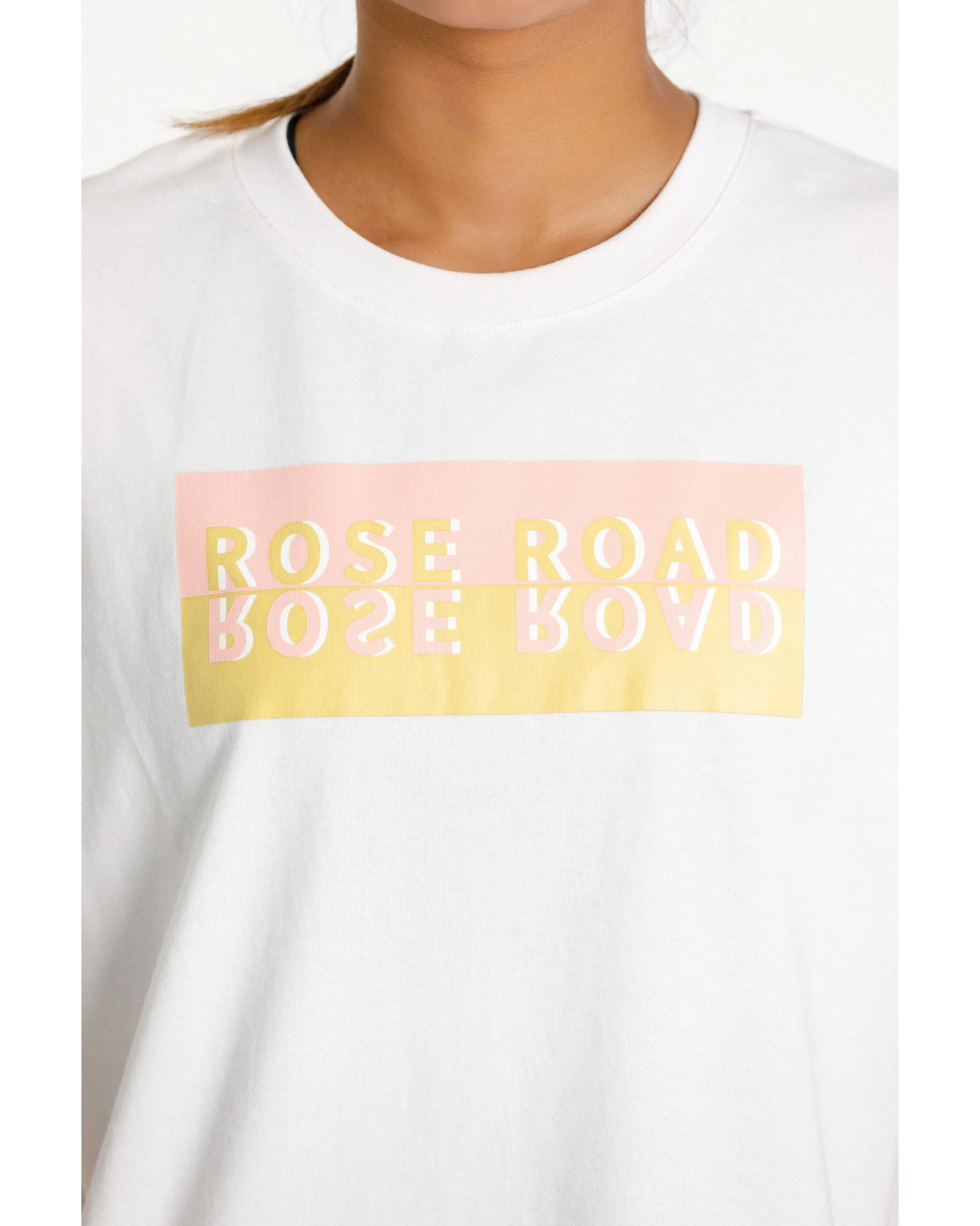 Featuring a crew neckline, tee shirt sleeve length just shy of the elbow, boxy fit through the body, straight cut hemline and our Circular Rose Road print on the chest.