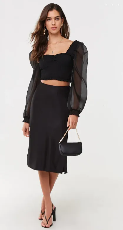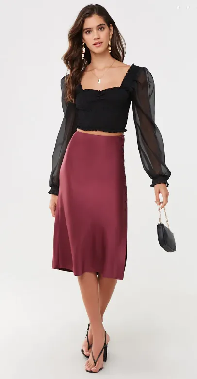A satin knee-length skirt featuring front button closures and a front leg slit.