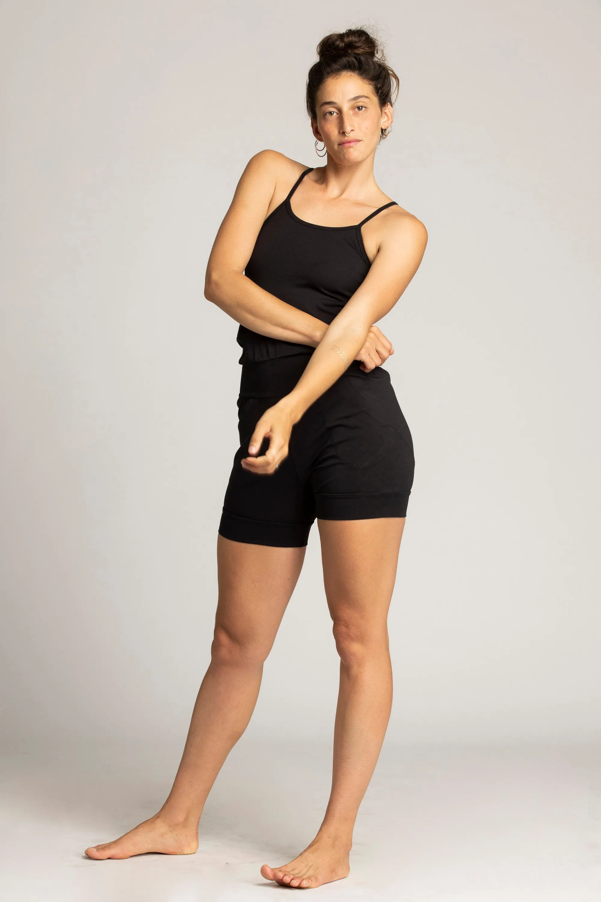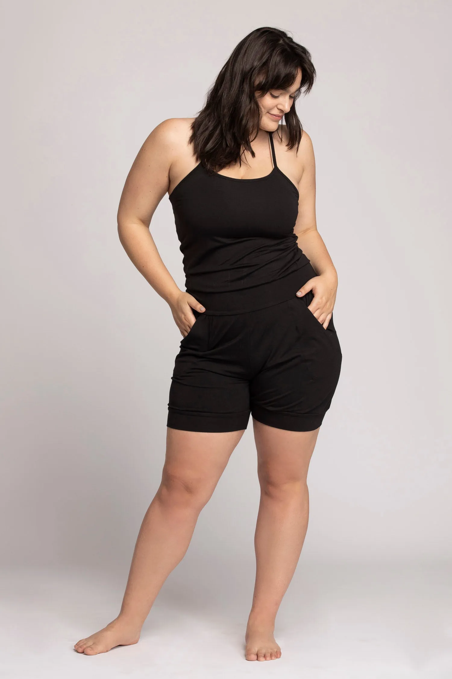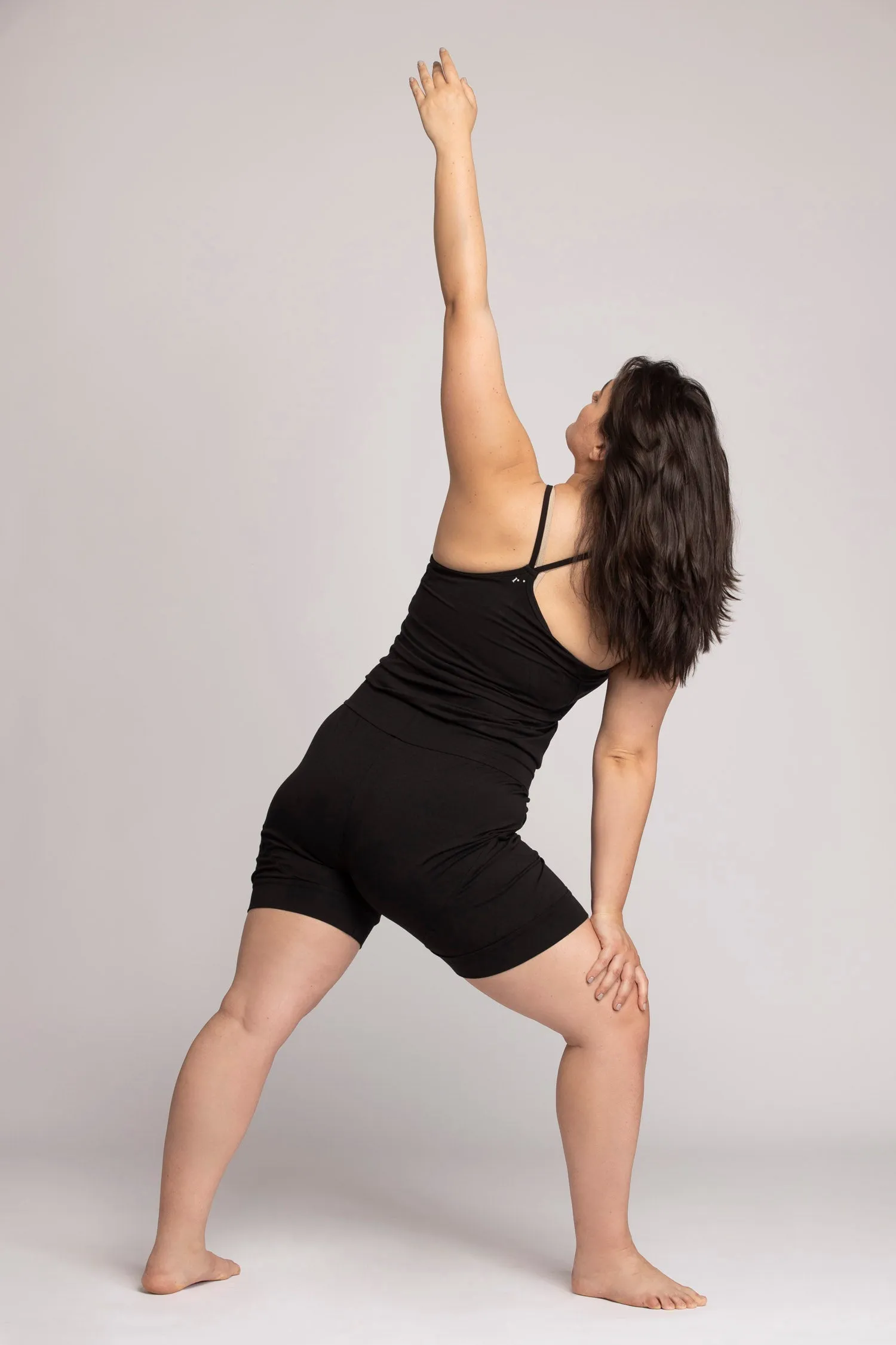 Our Short Yoga Jumpsuit is designed to let you focus on your practice. Featuring a wide waistband and thigh cuffs to keep your top and pants in place, our jumpsuit is both comfortable and flattering, so you can feel confident. Enjoy your practice with ease in our soft modal fabric jumpsuit.