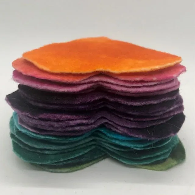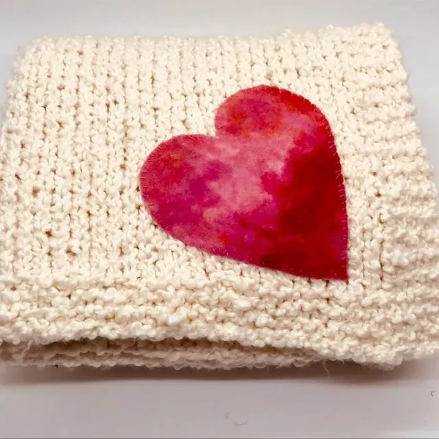 This kit is one skein of Island Cotton (the softest cotton you'll ever feel!) and two hand dyed wool felt hearts. The pattern for knitted hearts is included if you wish to knit hearts but I chose to just stitch on my felt hearts. So darn cute! This is a rather smallish blanket so can be used for the stroller or car seat and is the perfect size for a toddler to drag around as her security blankie.