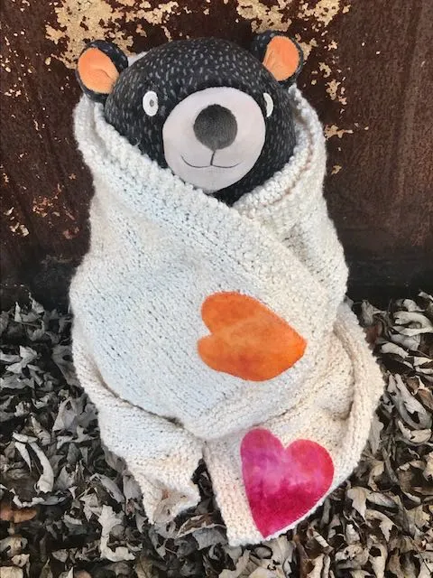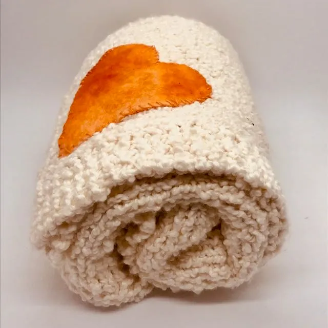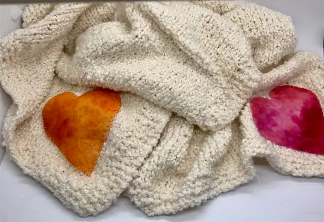 Kit includes one skein of Island Cotton, two hearts, pattern for blanket and for knitted hearts. PLEASE SPECIFY WHAT COLOR HEARTS YOU WANT. For example, two pink or two green or one pink, one purple.