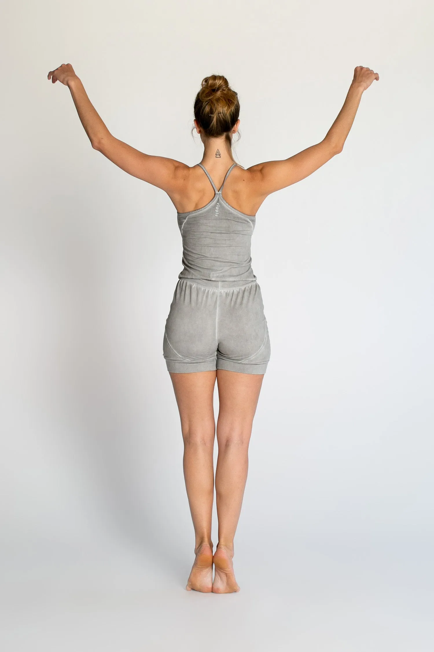 Our Stonewash Short Yoga jumpsuit features a wide fabric waistband to keep the top in place during any pose and thigh cuffs to keep the pants securely in place. Flattering and practical, it's the perfect choice for your next workout.