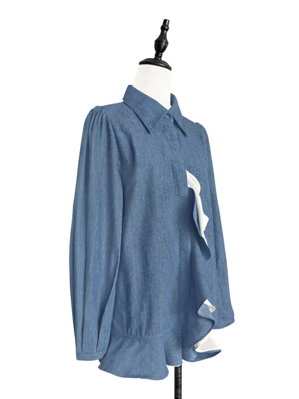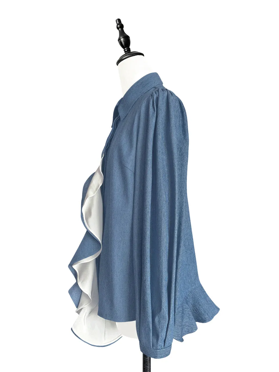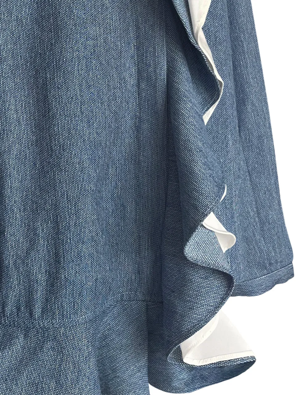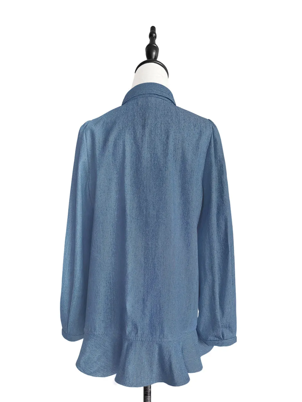 We've updated our overshirt for the season in three autumn shades- two denim colours and a silky khaki, with lace layered ruffles from along the packet to one side of the hem. True to size (yet slightly bigger than our silky shirt), it's an Autumn weight and designed to be worn over dresses/ blouses as the perfect Autumn cover up.