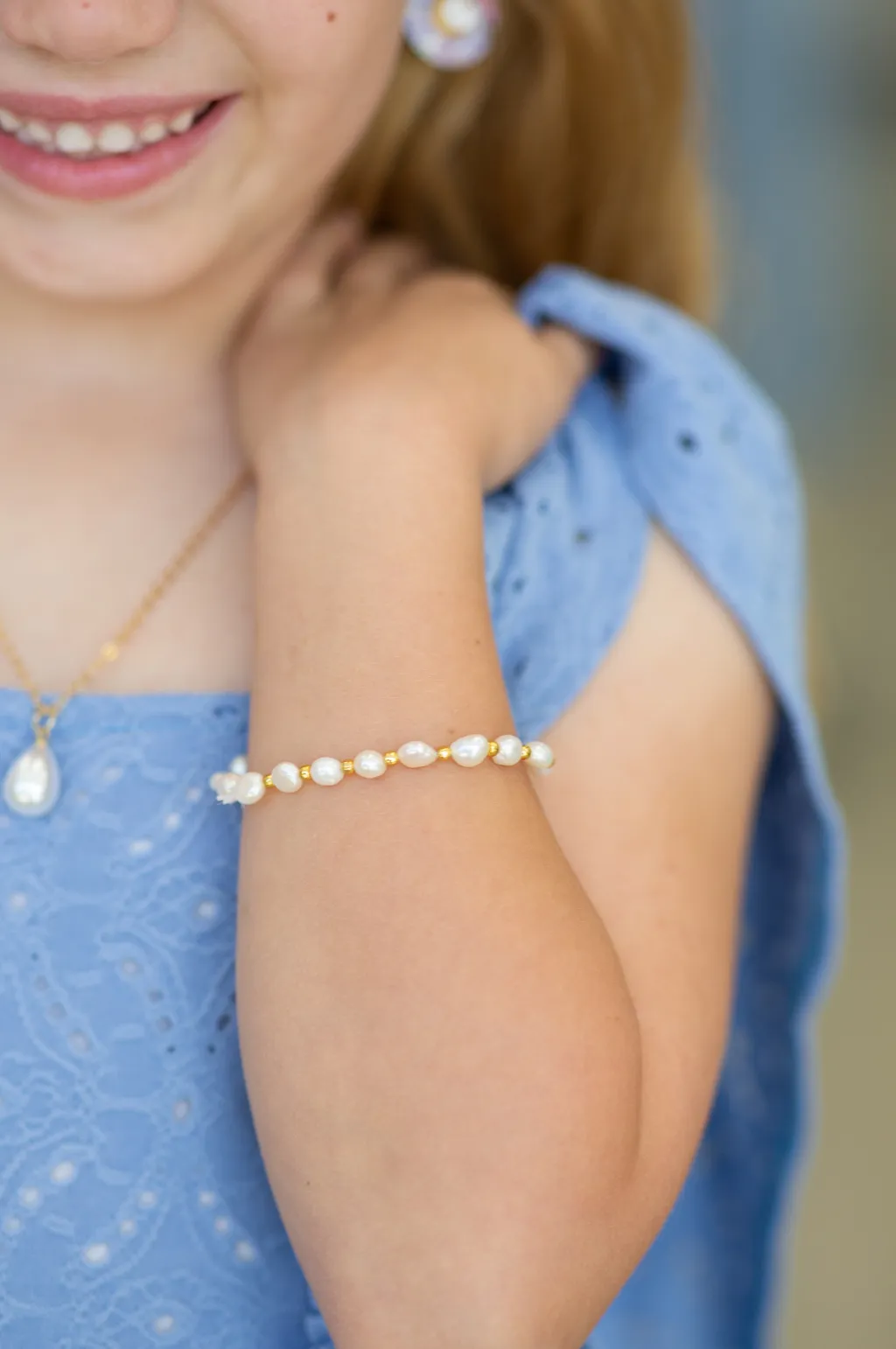 Adorn your mini-me with the sparkling Pearla 'Gracie' Bracelet! This delightful bracelet features fancy pearls and shiny gold beads which is sure to bring a smile to their face.