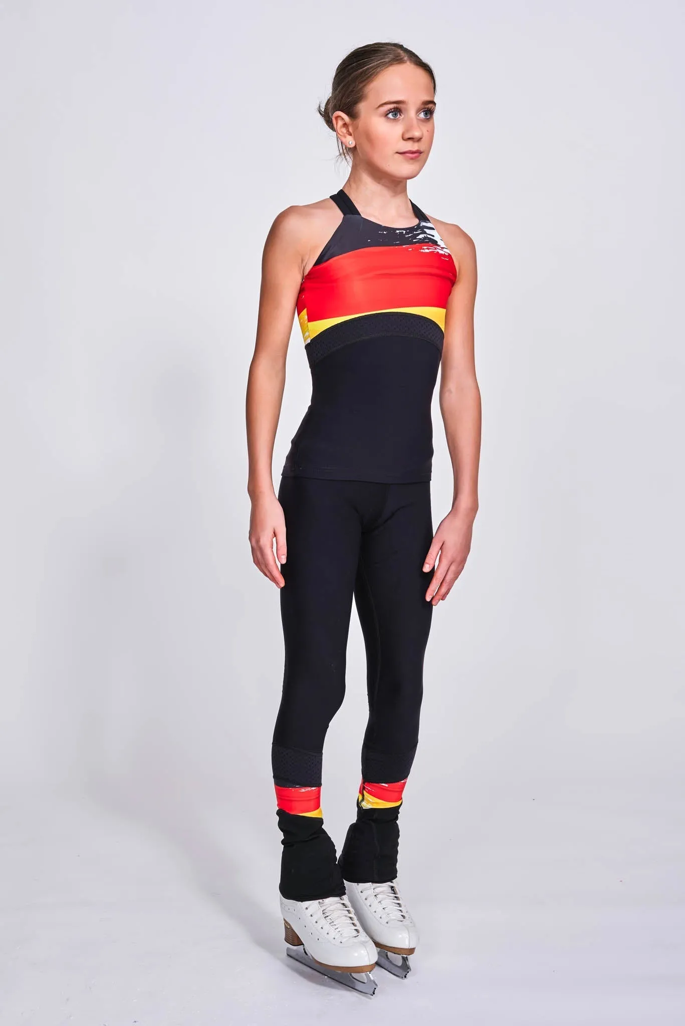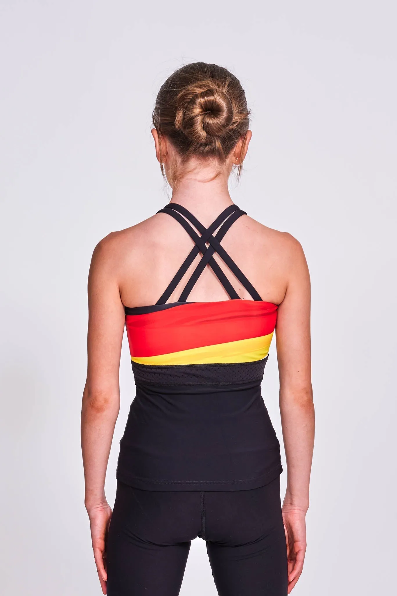 Our Unite tank top has a high-rise round neck and stylish strappy detailing which criss-crosses at the back. On the front lower left side of the top, you’ll see the Chique Sport reflective logo, which is discreet while still adding that distinctive branding. Meanwhile, a mesh panel undercuts the chest area and runs round to the back of the top, giving extra support and flexibility during movement. The top chest panel features the German flag.