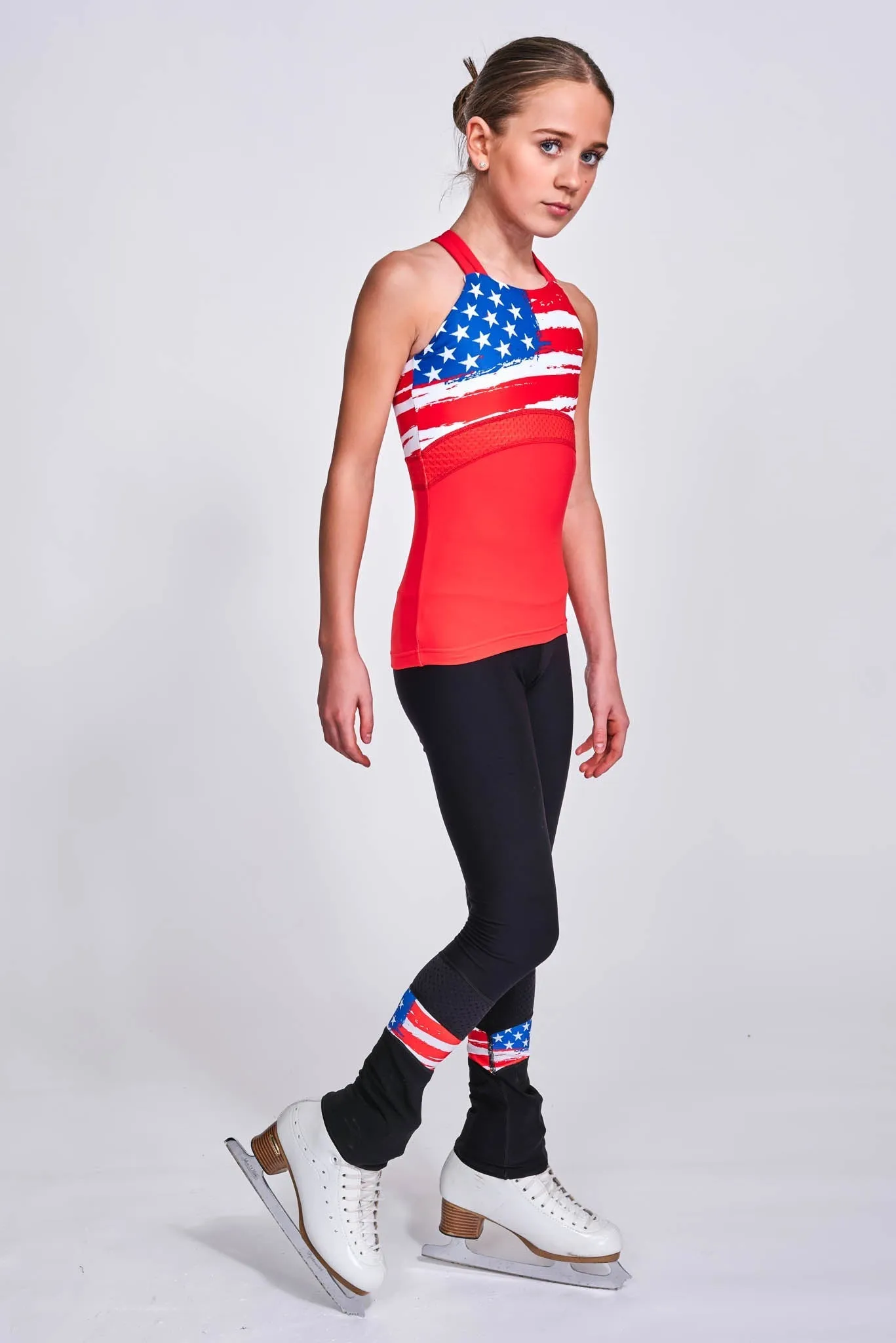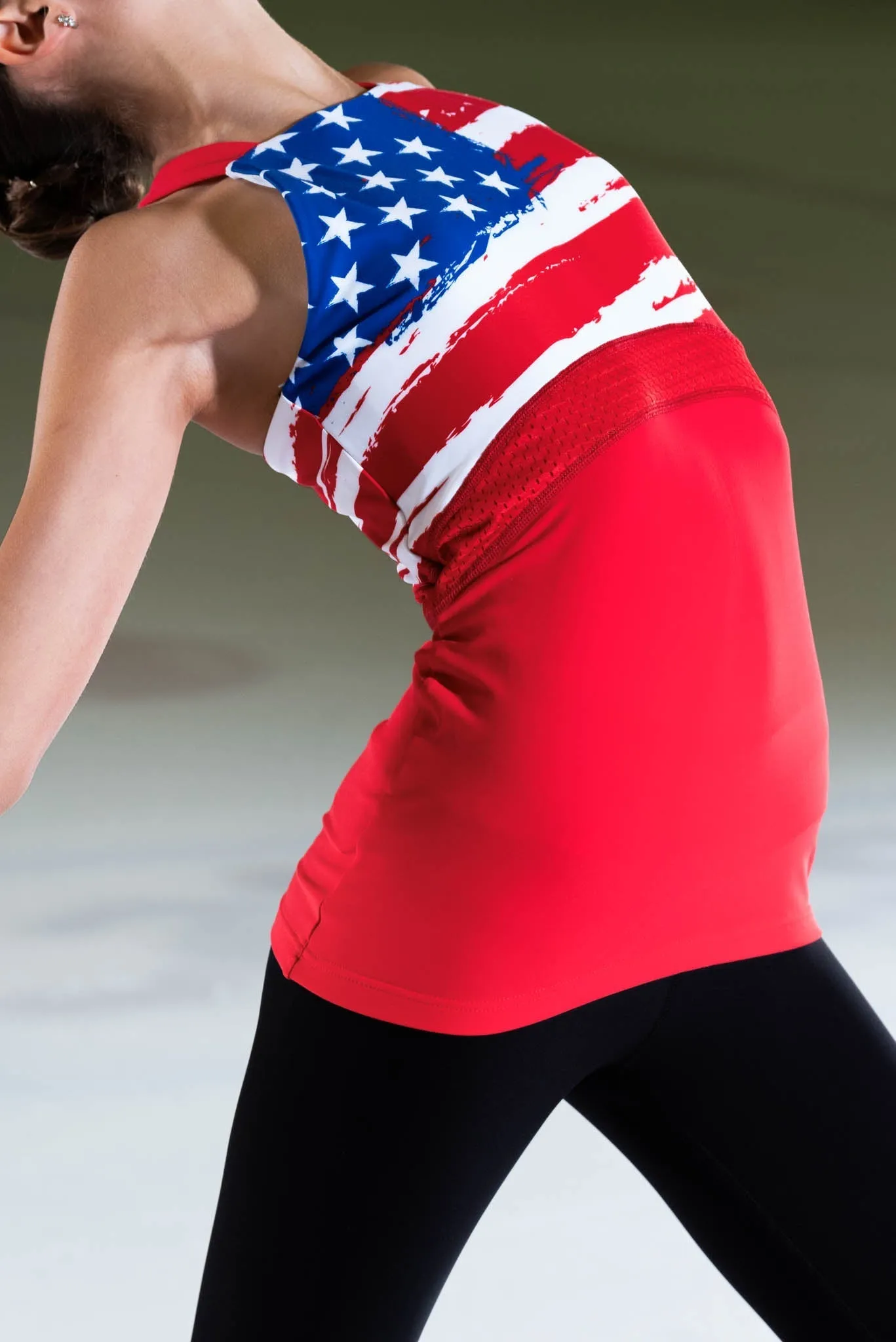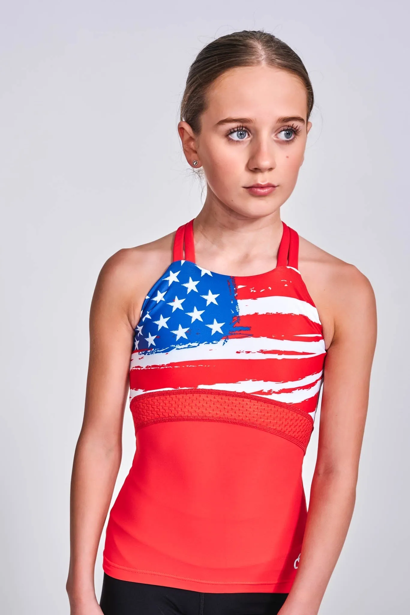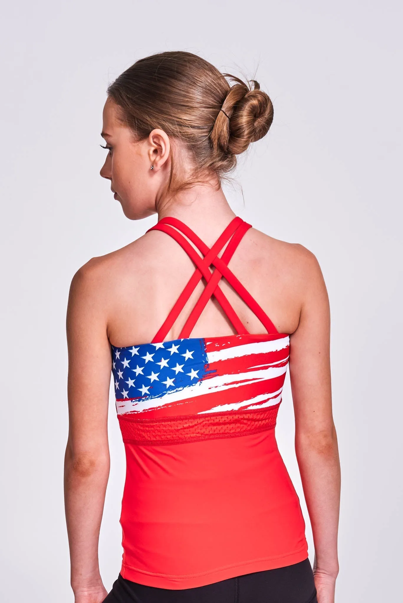 Our Unite tank top has a high-rise round neck and stylish strappy detailing which criss-crosses at the back. On the front lower left side of the top, you’ll see the Chique Sport reflective logo, which is discreet while still adding that distinctive branding. Meanwhile, a mesh panel undercuts the chest area and runs round to the back of the top, giving extra support and flexibility during movement. The top chest panel features the American flag.