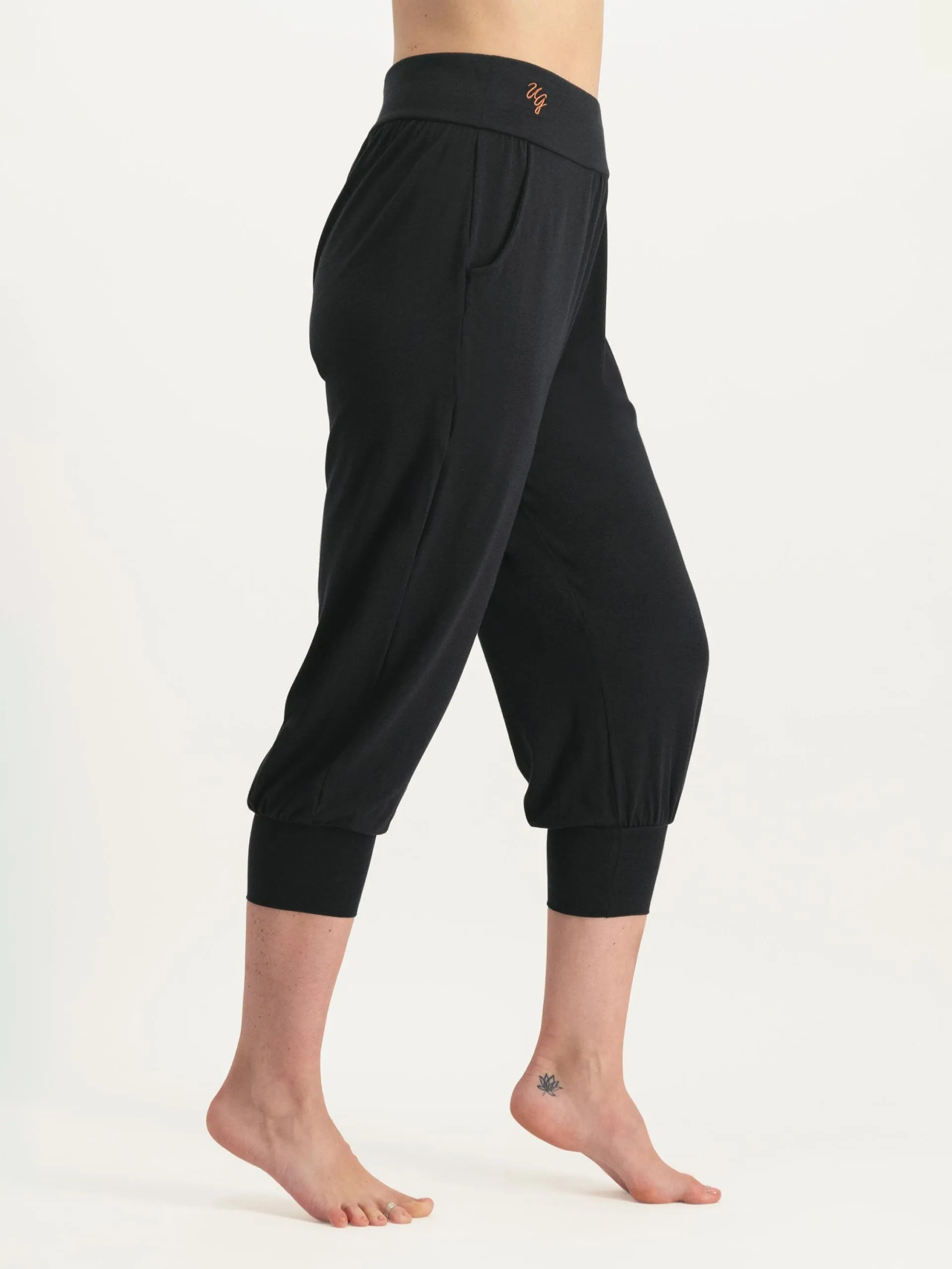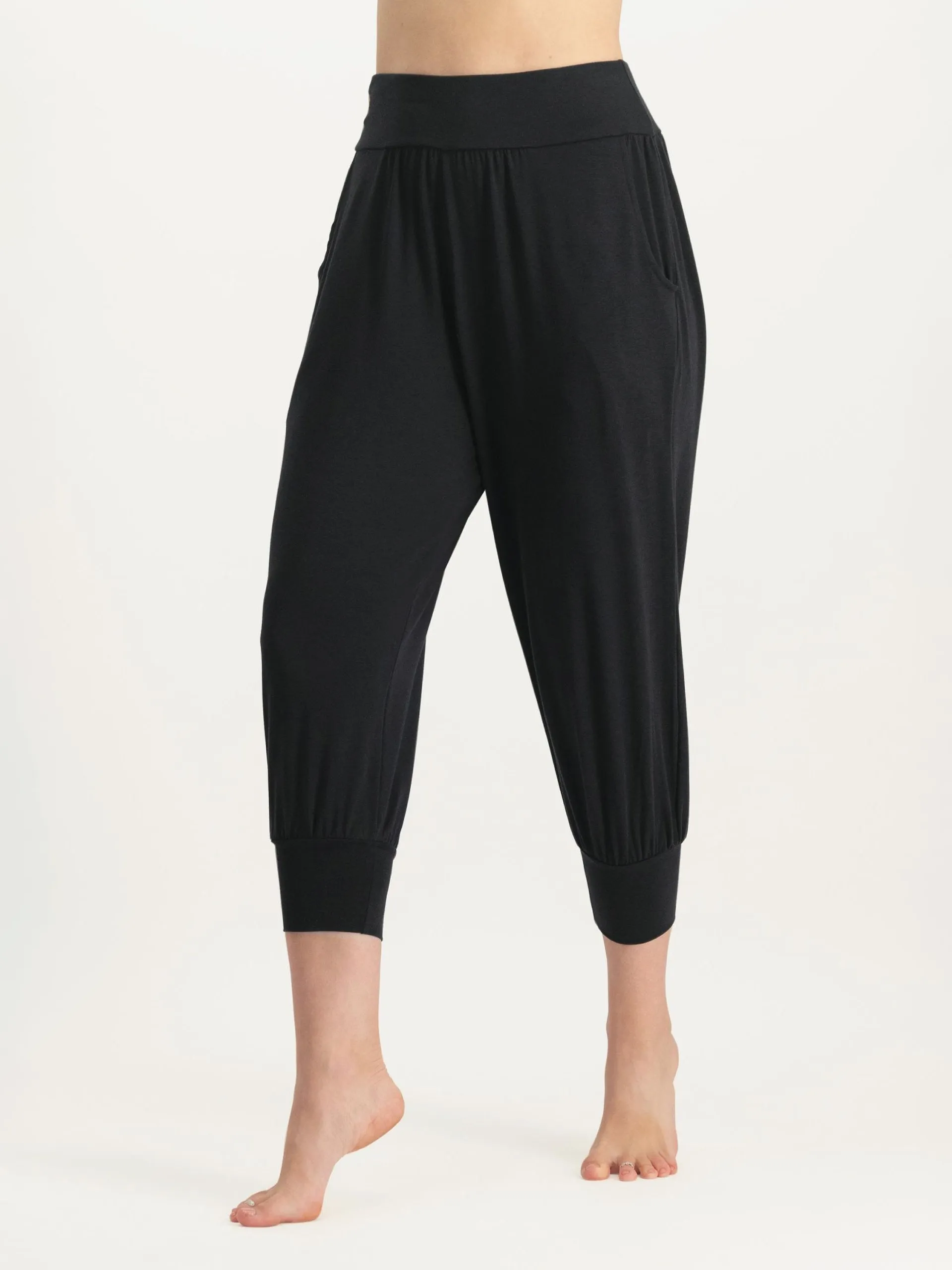 The Isa loose-fit yoga harem trousers are made of light and comfortable bamboo and organic cotton, which feels wonderfully soft on your skin. Styled with a medium-high waist and long ankle/calf cuffs, and designed to be worn as 7/8th length.