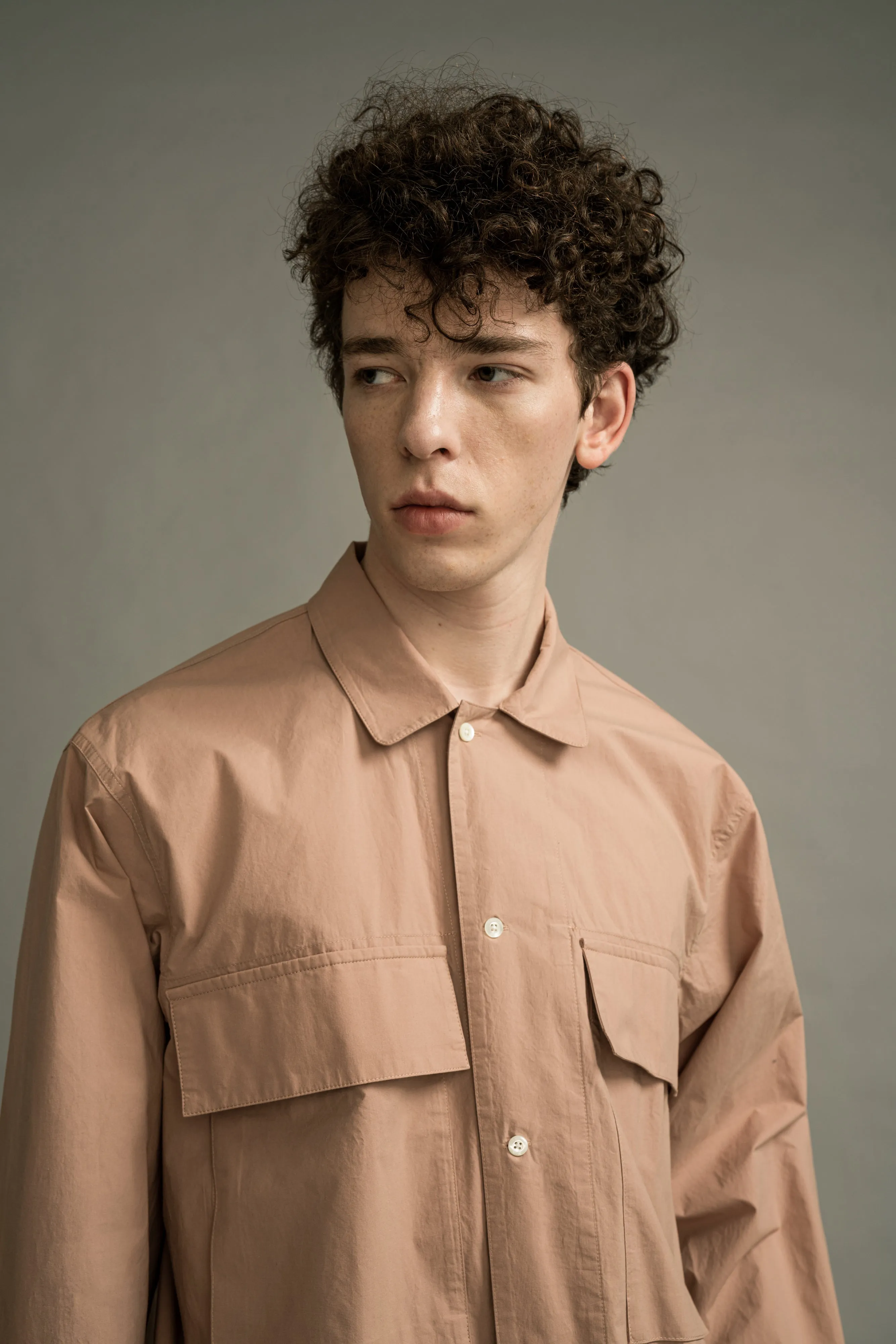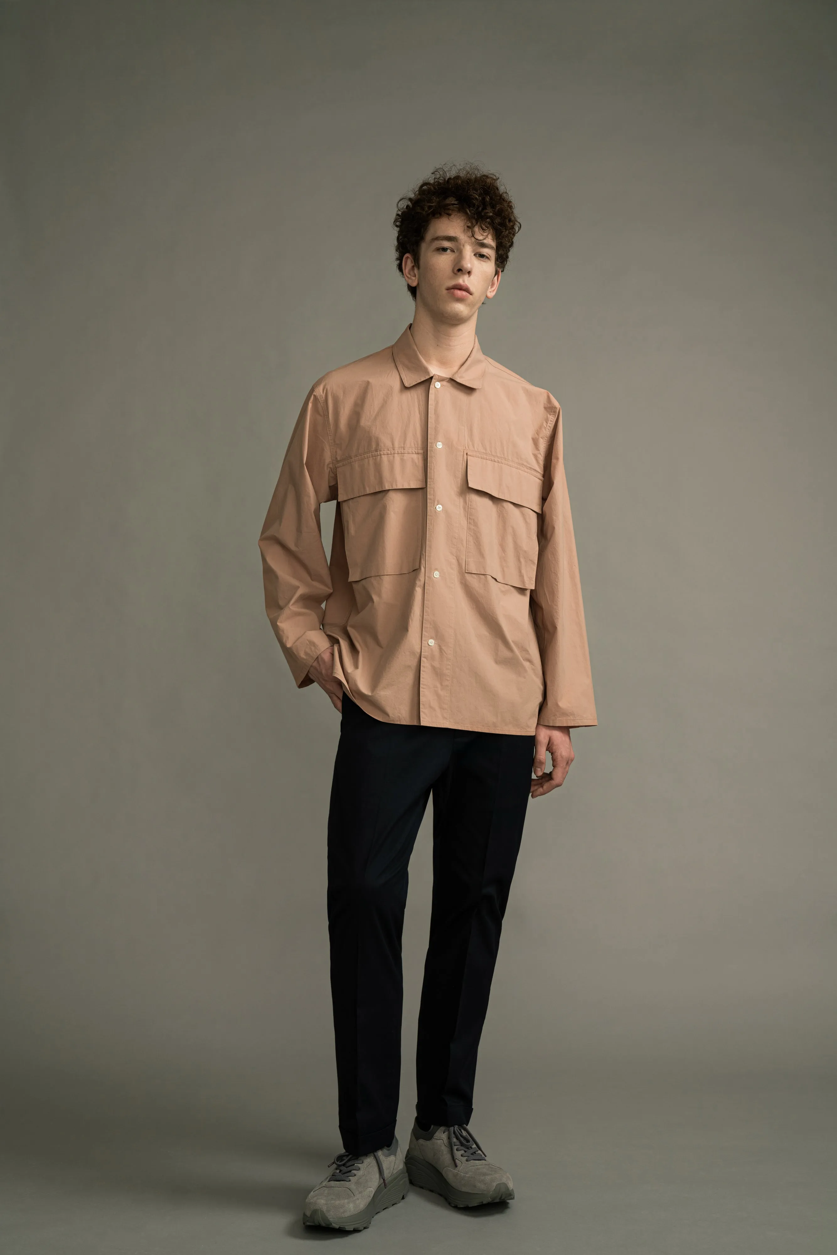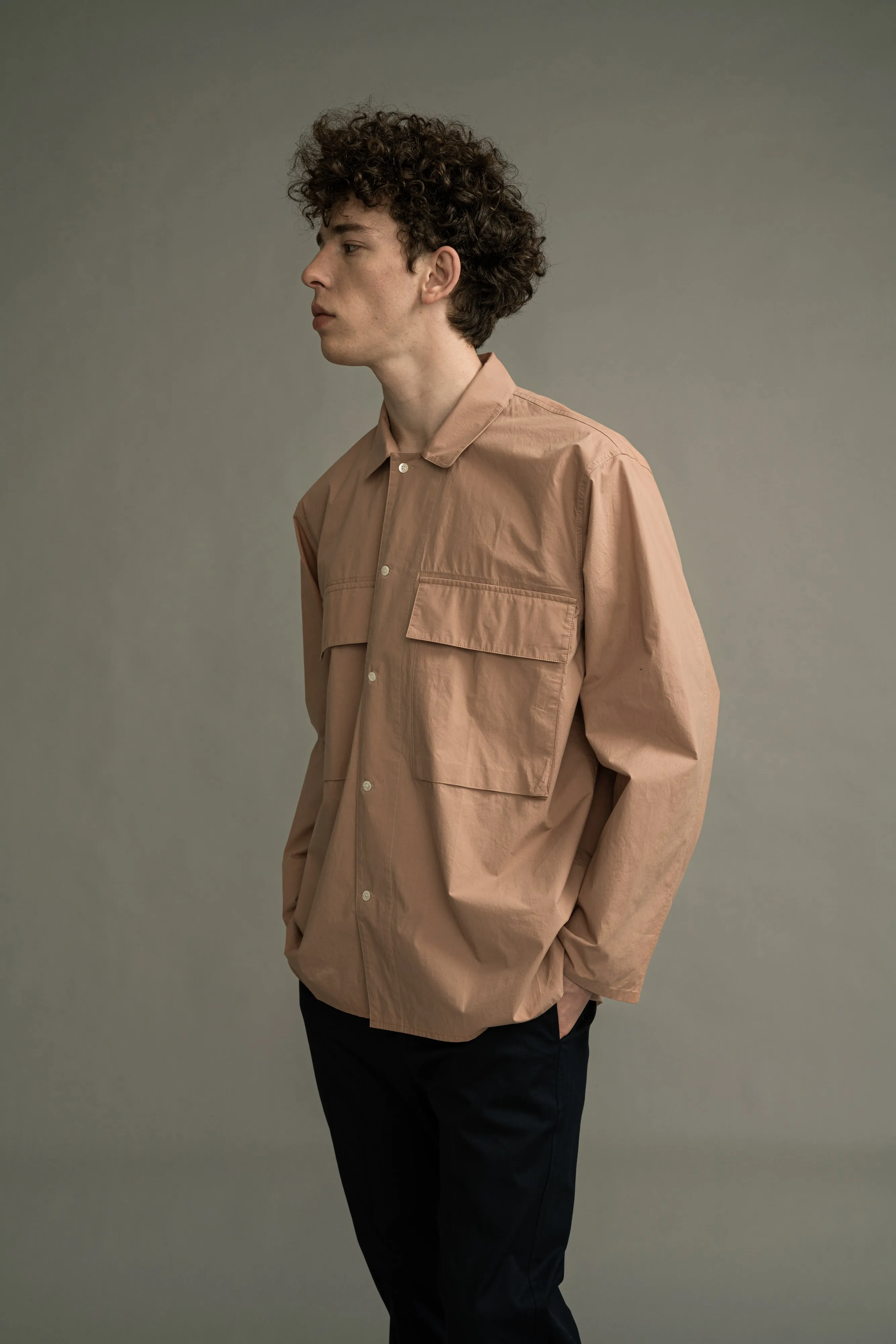 Cotton broad patch pocket shirt jacket. Oversized fit.